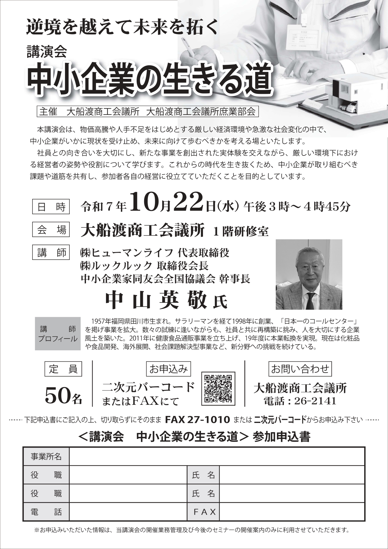 本講演会は、物価高騰や人手不足をはじめとする厳しい経済環境や急激な社会変化の中で、中小企業がいかに現状を受け止め、未来に向けて歩むべきかを考える場といたします。