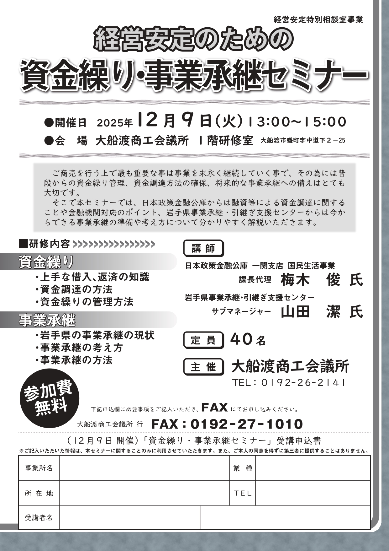 ご商売を行う上で最も重要な事は事業を末永く継続していく事で、その為には普段からの資金繰り管理、資金調達方法の確保、将来的な事業承継への備えはとても大切です。そこで本セミナーでは、日本政策金融公庫からは融資等による資金調達に関することや金融機関対応のポイント、岩手県事業承継・引継ぎ支援センターからは今からできる事業承継の準備や考え方について分かりやすく解説いただきます。