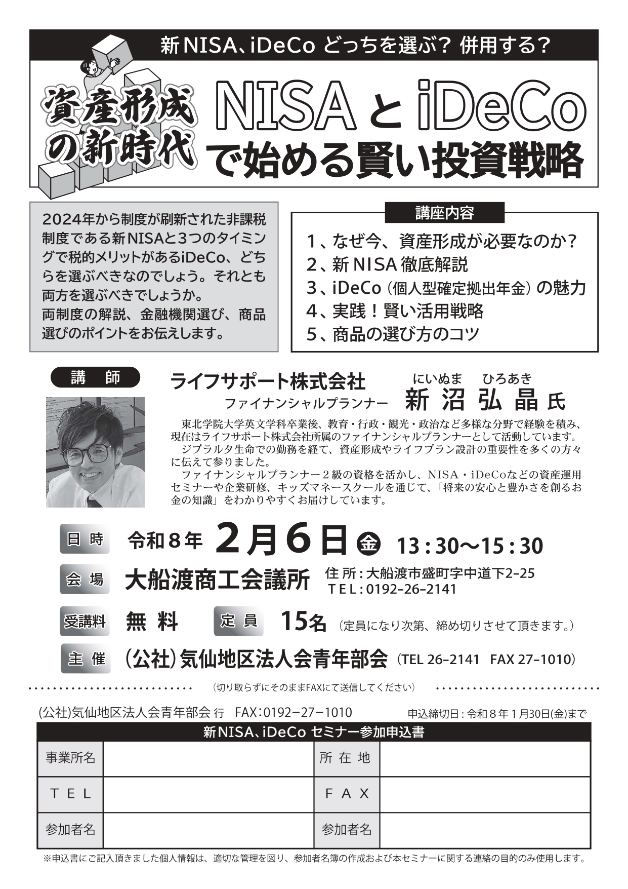 【講 師】 新沼 弘晶 氏(ライフサポート㈱ ファイナンシャルプランナー)