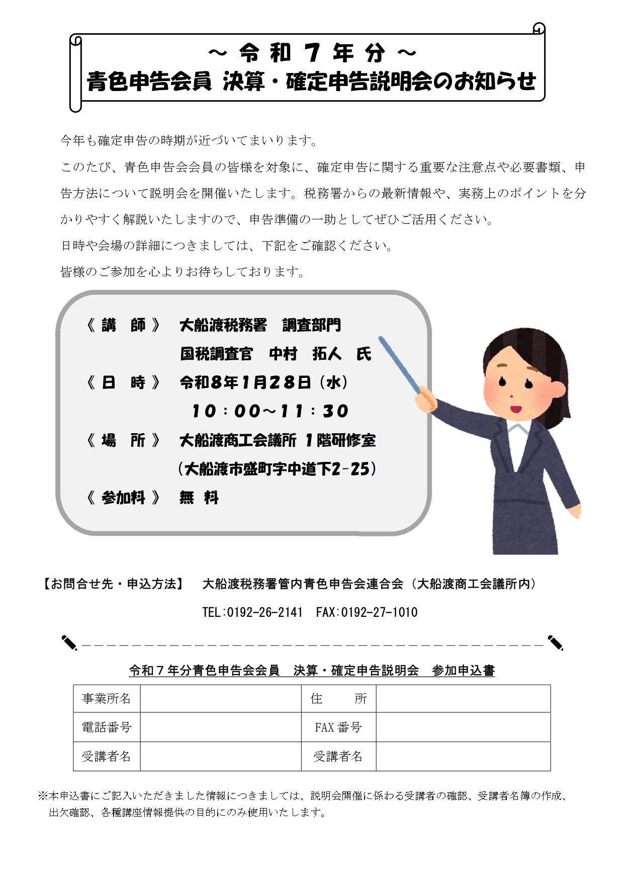 今年も確定申告の時期が近づいてまいります。このたび、青色申告会会員の皆様を対象に、確定申告に関する重要な注意点や必要書類、申告方法について説明会を開催いたします。税務署からの最新情報や、実務上のポイントを分かりやすく解説いたしますので、申告準備の一助としてぜひご活用ください。日時や会場の詳細につきましては、下記をご確認ください。皆様のご参加を心よりお待ちしております。