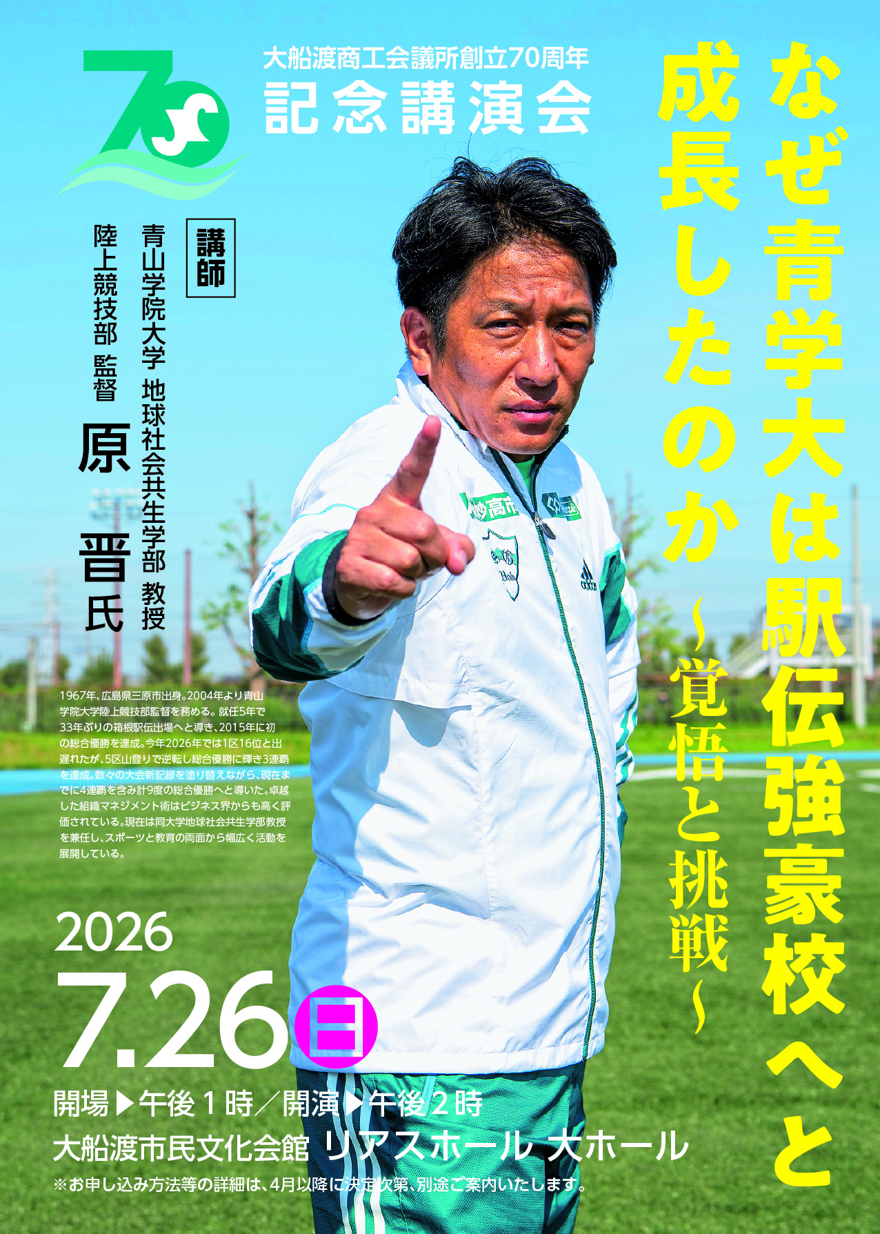 【創立70周年記念講演会】 なぜ青学大は駅伝強豪校へと成長したのか ~覚悟と挑戦~
